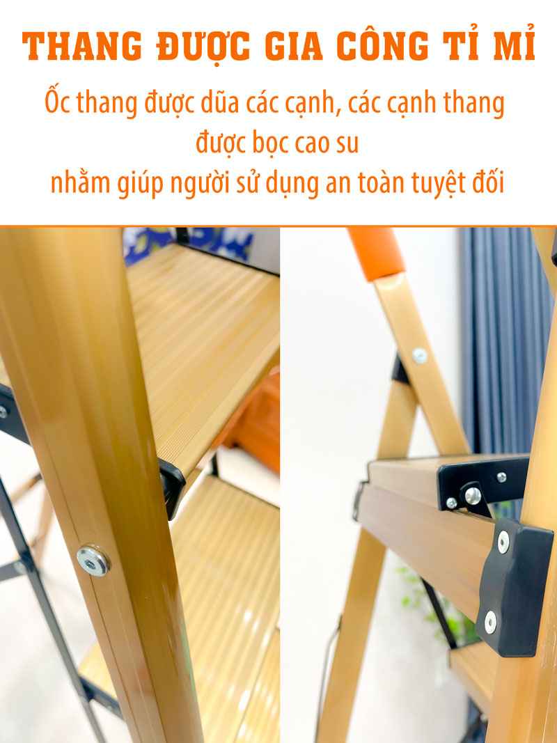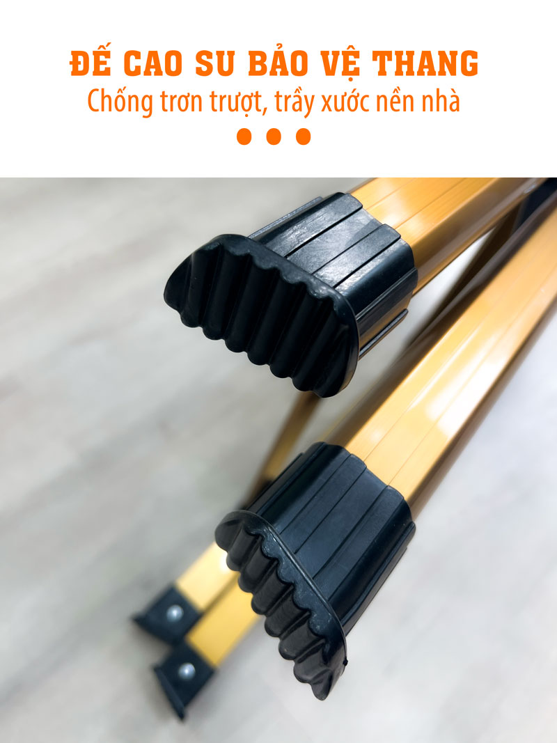 ✓ Đế thang làm bằng đế cao su chống trơn trượt, không xây xước cho nền nhà, giúp thang đứng vững hơn khi đặt ở các mặt phẳng có ma sát kém.