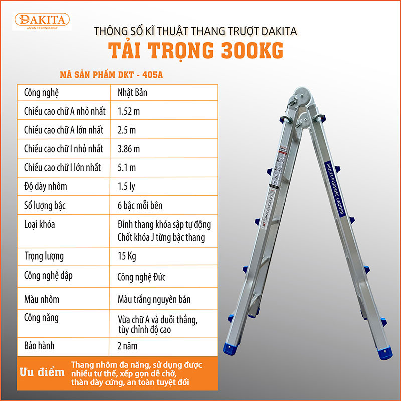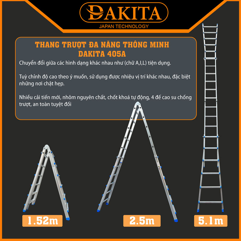 + Thang nhôm trượt chữ A DAKITA DKT-405A có thể dễ dàng phục vụ cho nhiều mục đích sử dụng khác nhau cho chiều cao từ 1.2m - 5m