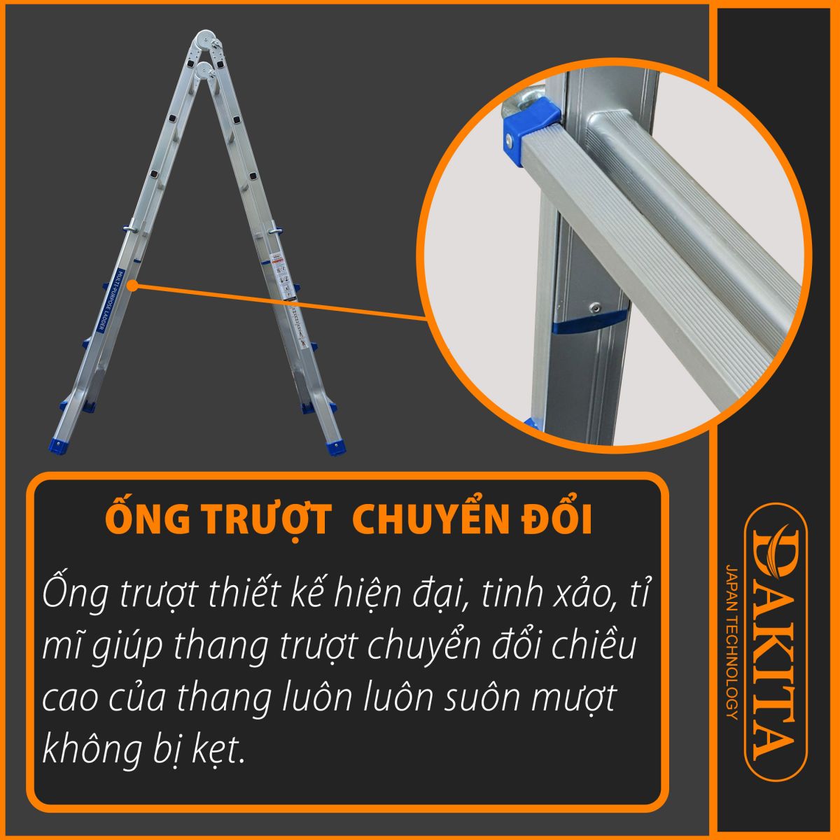 + Thang DKT-405A có thiết kế linh hoạt, chuyển đổi dễ dàng thành thang chữ A, thang chữ I kéo dài bằng nút khoá bản lề tự động ở 2 bên thang.