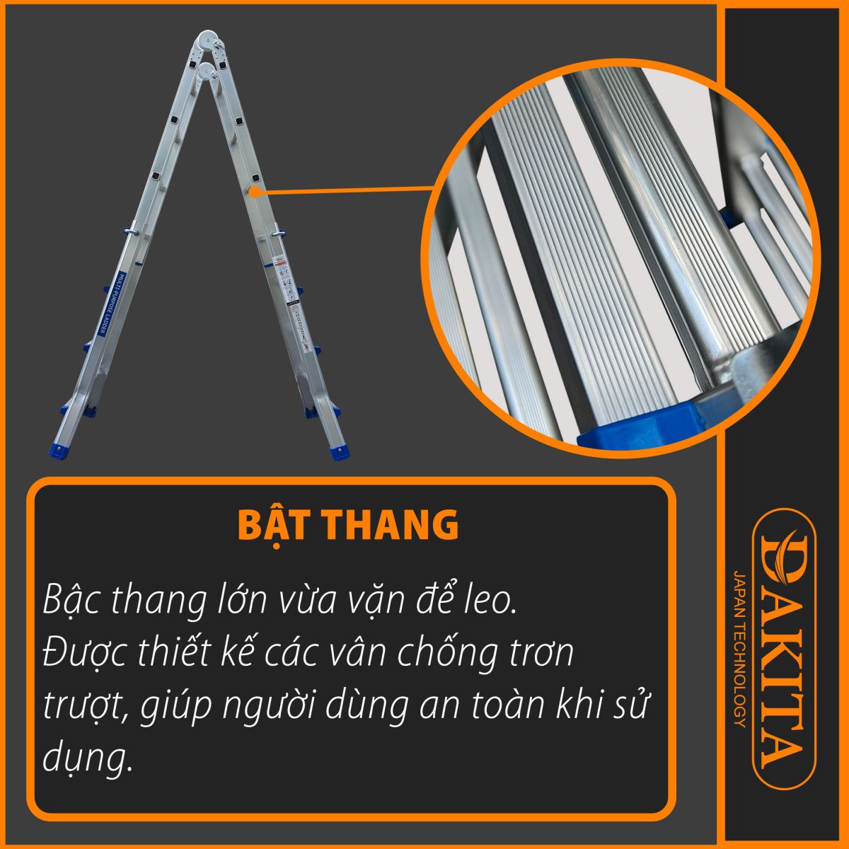 + Thang DKT-406A có thiết kế linh hoạt, chuyển đổi dễ dàng thành thang chữ A, thang chữ I kéo dài bằng nút khoá bản lề tự động ở 2 bên thang.